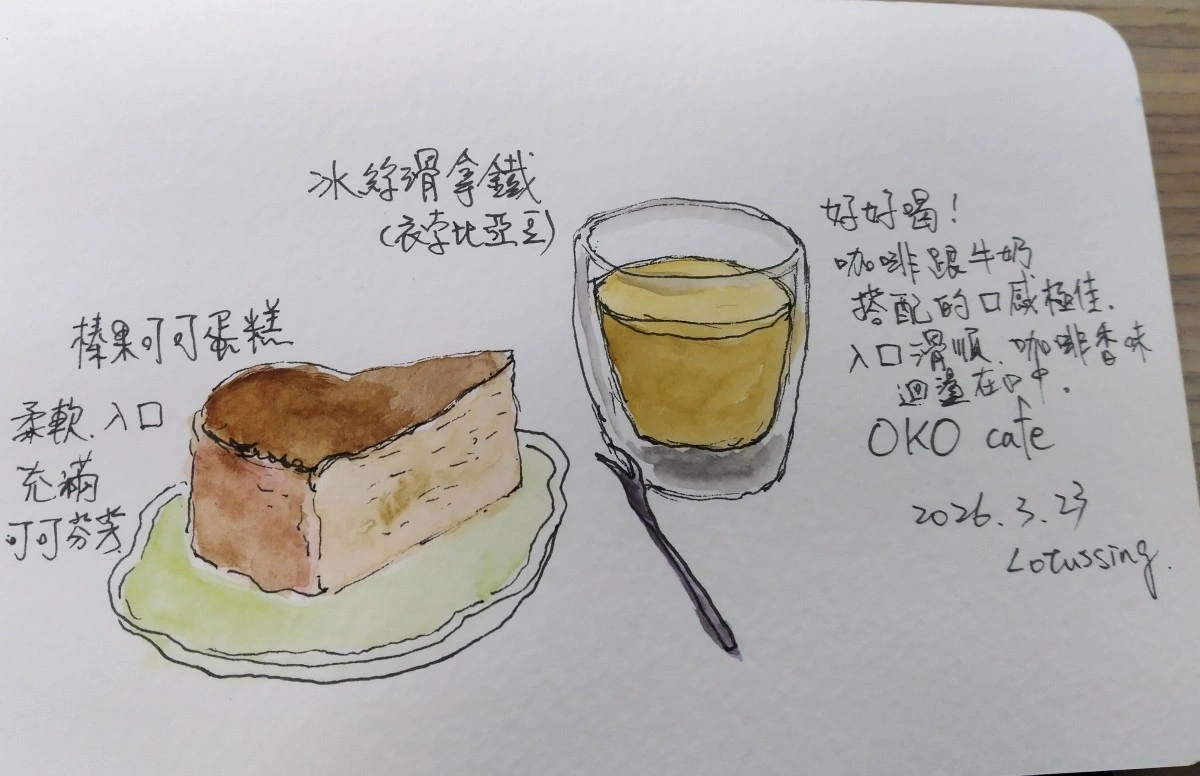 後續第二幅速寫就在咖啡廳完成。獨享專屬我的座位,有足夠的時間與餘裕描繪、甚至上色。只是美食在前,按捺著「好想吃」的念頭作畫,折磨程度似乎不遜於在外面速寫。不知道擅長畫點心的老師們是怎麼克服這種心情呢?