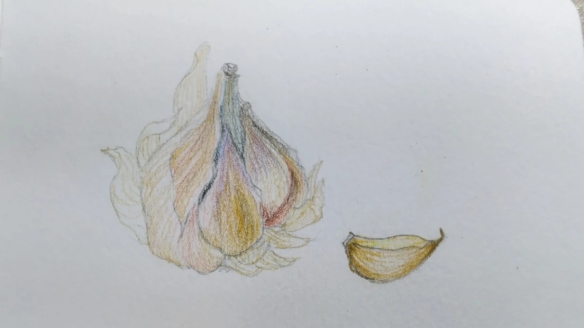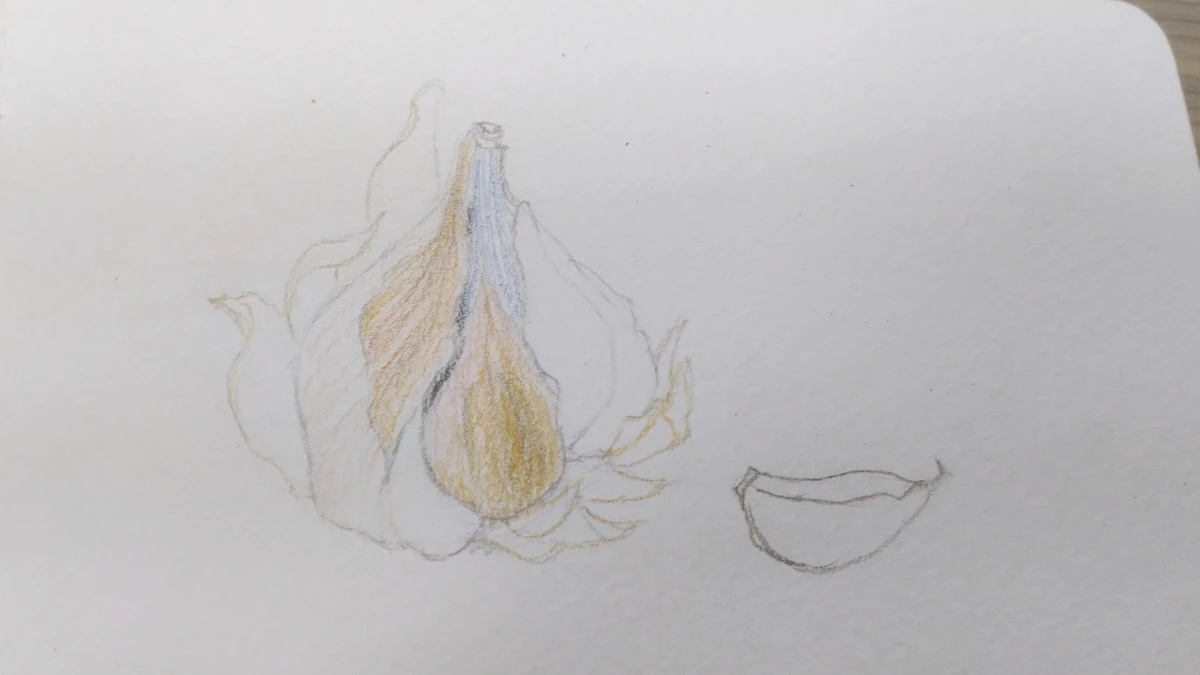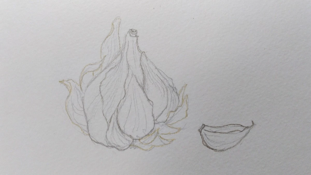 之前逛迪化街順便買了一袋蒜球。因為太多,部分要剝皮放冷凍保存。我剝著剝著突然想到,好像以前沒認真觀察過完整大蒜,既然都有素材了,乾脆來練畫圖吧。我看著手邊的完整蒜球、剝到一半的不完整蒜球跟蒜瓣,不知哪根筋不對,覺得挑戰完整蒜球太沒意思了,要就挑戰「不完整蒜球+蒜瓣」嘛。於是我挑個還算飽滿好看的蒜球,輕微剝下外層的皮,取出其中一瓣放在旁,就開始描草稿了。