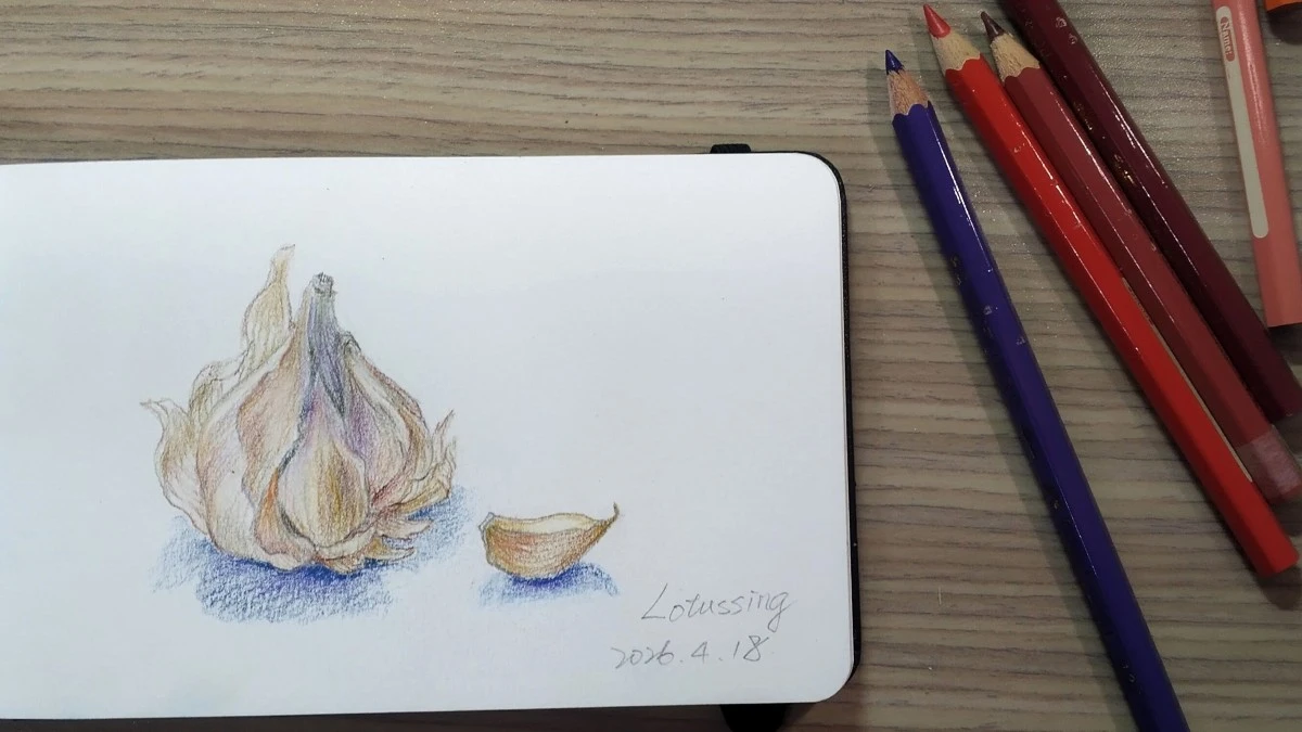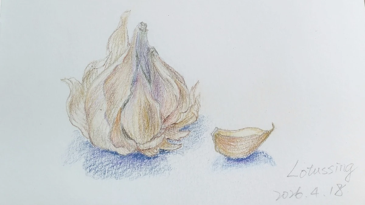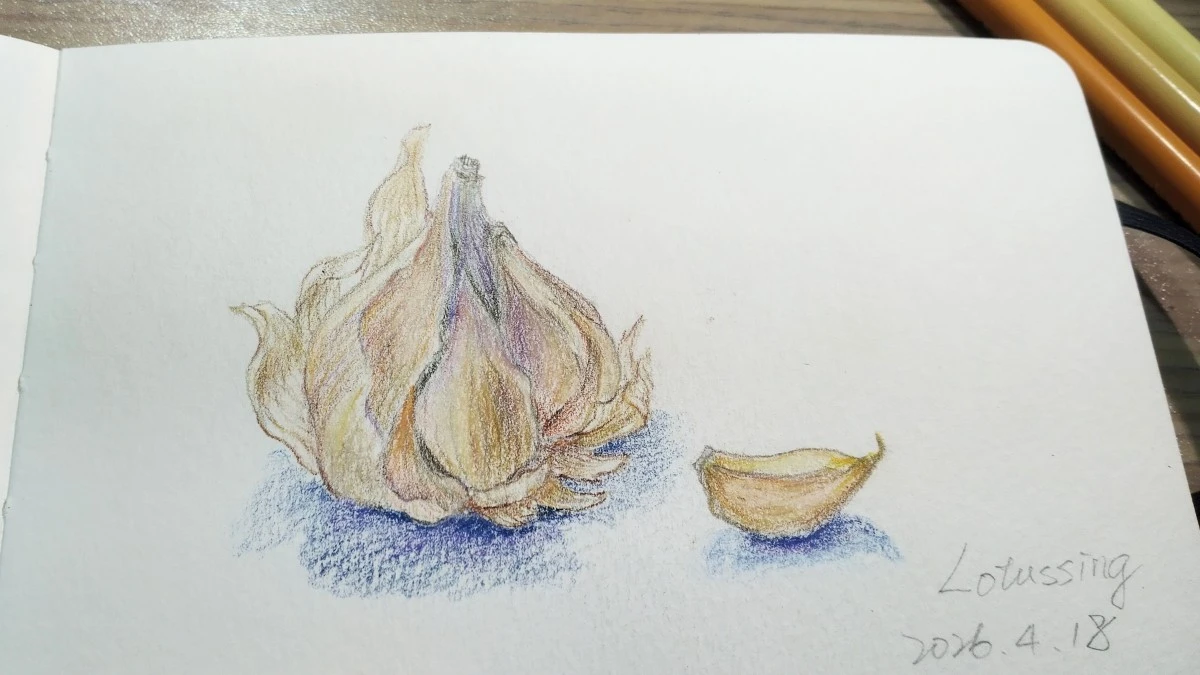 好啦,總之這是個最初滿懷壯志,可是中間到結尾越畫越心虛的嘗試。本想全部用卡達色鉛筆完成,後續還是請出老夥伴輝柏色鉛筆加強蒜瓣上的紋路,以及霹靂馬的油性色鉛筆(奶油黃)增加低彩度的黃色色澤。由於剛買回來的新鮮蒜球,外表會透出類似紅蔥頭那種紫紅色,風乾後紫色變黯淡甚至變灰了。這幅算是加入了剛買回來的「印象」吧。最後明明畫出充滿繽紛色彩(?)的蒜球,但是因為拍照調光導致細節不見了。好傷心。
